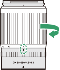 A lente é retrátil e deve ser estendida antes do uso. Gire o anel de zoom conforme mostrado até que a lente se encaixe na posição estendida. As fotos só podem ser tiradas quando a marca de distância focal aponta para posições entre 50 e 250 na escala de distância focal.