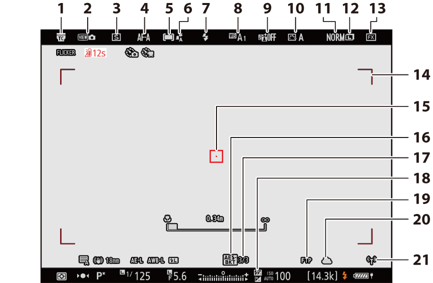 - مؤشر خارج نطاق التركيز البؤري (تركيز بؤري تلقائي للمنطقة؛ 0 التقاط الصور الفوتوغرافية (الوضع b))