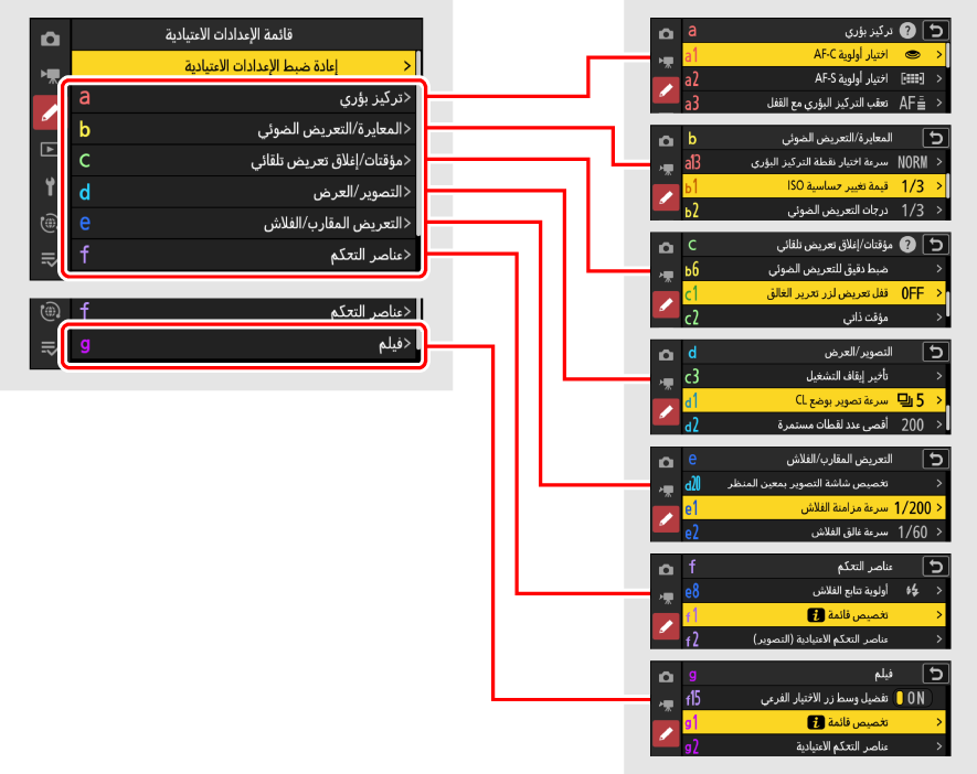 تستخدم الإعدادات الاعتيادية لتخصيص إعدادات الكاميرا لكي تناسب التفضيلات الشخصية. تنقسم قائمة الإعدادات الاعتيادية إلى مستويين.