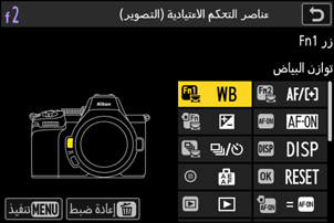 D [أفق افتراضي] اضغط عنصر التحكم لتمكين عرض الأفق الافتراضي. اضغط مرة أخرى لإخفاء العرض. يمكن تحديد نوع العرض باستخدام الإعداد الاعتيادي d17 [نوع أفق افتراضي]. k [عرض ضوء النجوم (المنظر المباشر للصور)] اضغط عنصر التحكم هذا لتشغيل عرض ضوء النجوم. اضغط مرة أخرى لإنهاء عرض ضوء النجوم. m [وضع العرض (المنظر المباشر للصور)] اضغط على عنصر التحكم هذا لتبديل الخيار المحدد للإعداد الاعتيادي d10 [وضع العرض (المنظر المباشر للصور)] من [عرض تأثيرات الإعدادات] إلى [الضبط لسهولة العرض] أو العكس. W [عرض زيادة التركيز البؤري إلى الذروة] اضغط عنصر التحكم هذا مرة واحدة لتمكين وظيفة "زيادة التركيز البؤري إلى الذروة" في حال تحديد MF لوضع التركيز البؤري. اضغط مرة أخرى لإنهاء زيادة التركيز البؤري إلى الذروة. 8 [تمكين/إلغاء تمكين Fn باللمس] اضغط على عنصر التحكم هذا لتمكين أو إلغاء تمكين Fn باللمس. O [قائمتي] اضغط عنصر التحكم لعرض "قائمتي". 3 [بلوغ أول بند في قائمتي] اضغط عنصر التحكم للانتقال إلى البند الأول في "قائمتي". اختر هذا الخيار للوصول السريع إلى بند القائمة المستخدم بكثرة. K [عرض] اضغط على عنصر التحكم لبدء العرض. l [العرض المرشح] اضغط على عنصر التحكم لعرض الصور التي تستوفي المعايير المحددة للإعداد [معيار العرض المرشح] فقط في قائمة العرض. N [العرض المرشح (تحديد معيار)] اضغط على عنصر التحكم هذا للانتقال إلى [معيار العرض المرشح] في قائمة العرض. Y [الزوم الآلي +] عند تركيب عدسة زوم آلي، تقوم الكاميرا بالتكبير أثناء الضغط على عنصر التحكم هذا. يتم تمكين هذا الخيار تلقائيًا في حالة تحديد [الزوم الآلي −] للإعداد [زر Fn2]. Z [الزوم الآلي −] عند تركيب عدسة زوم آلي، تقوم الكاميرا بالتصغير أثناء الضغط على عنصر التحكم هذا. يتم تمكين هذا الخيار تلقائيًا في حالة تحديد [الزوم الآلي +] للإعداد [زر Fn1]. e [نفس زر AF-ON] يقوم عنصر التحكم بالدور المحدد حاليًا لزر AF-ON. J [اختيار منطقة الصورة] اضغط عنصر التحكم وأدر قرص التحكم لاختيار منطقة الصورة. 8 [جودة/حجم الصورة] اضغط عنصر التحكم وأدر قرص التحكم الرئيسي لاختيار خيار جودة الصورة وأدر قرص التحكم الفرعي لتحديد حجم الصورة. E [تعويض التعريض الضوئي] اضبط تعويض التعريض الضوئي إما بالضغط مع الاستمرار على عنصر التحكم هذا وإدارة أحد أقراص التحكم أو بإدارة حلقة التحكم الموجودة بالعدسة. 9 [حساسية ISO] اضبط حساسية ISO إما بالضغط مع الاستمرار على عنصر التحكم هذا وإدارة أحد أقراص التحكم أو بإدارة حلقة التحكم الموجودة بالعدسة. m [توازن البياض] لتحديد أحد خيارات توازن البياض، اضغط مع الاستمرار على عنصر التحكم هذا وأدر قرص التحكم الرئيسي. توفر بعض الخيارات خيارات فرعية يمكن تحديدها عن طريق إدارة قرص التحكم الفرعي. y [D-Lighting نشطة] اضغط على عنصر التحكم وأدر أقراص التحكم لضبط D-Lighting نشطة. h [تلطيف البشرة] اضغط على عنصر التحكم وأدر قرص التحكم لضبط تلطيف البشرة. i [توازن انطباع الصورة الشخصية] اضغط على عنصر التحكم هذا وأدر قرص التحكم لاختيار وضع توازن انطباع الصورة الشخصية.