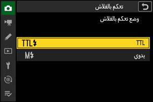 عند تركيب وحدة فلاش اختيارية طراز SB‑500 أو SB‑400 أو SB‑300 على الكاميرا، يمكن ضبط وضع التحكم بالفلاش ومستوى الفلاش وإعدادات الفلاش الأخرى باستخدام العنصر [تحكم بالفلاش] > [وضع تحكم بالفلاش] من قائمة تصوير الصور.