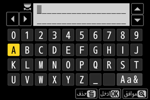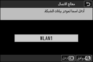 - للاتصال بشبكة باستخدام مُعرِّف SSID مخفي، ظلل خانة فارغة واضغط على J. بعد ذلك، اضغط على J، حيث تطلب منك الكاميرا إدخال مُعرِّف SSID.
