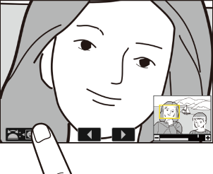 | اختيار الوجوه | يتم الإشارة إلى الوجوه التي يتم اكتشافها أثناء تكبير العرض بحدود بيضاء في نافذة الاستطلاع. قم بتدوير قرص التحكم الفرعي أو انقر الدليل الظاهر على الشاشة لعرض الوجوه الأخرى.
