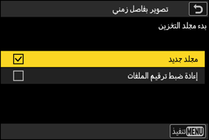 لا يمكن إعادة ضبط إعدادات قائمة التصوير عندما يكون التصوير الفوتوغرافي بفاصل زمني قيد التقدم.