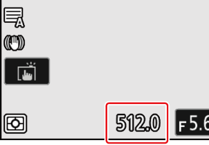- Показана е точната скорост на затвора. Например, скоростта на затвора, когато е избрана ¹⁄₅₀₀ s, е точно ¹⁄₅₁₂ s, което дисплеят показва като „512.0“, знаменателят.