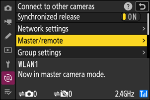 Името на групата, избрано на отдалечените камери, трябва да съвпада с избраното за главната камера. Изберете името чрез [ Свързване към други фотоап. ] > [ Име на група ] в мрежовото меню.