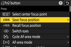 Vyberte jiný ovládací prvek v seznamu uživatelských ovládacích prvků a po zobrazení výzvy k výběru role zvýrazněte [ Uložení pozice zaostření ] a stiskněte 2 .