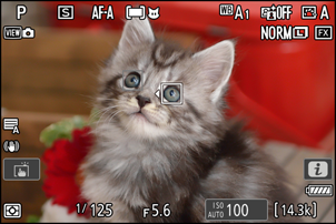 Pokud je při volbě [ Zvířata ] detekován pes, kočka nebo pták, zobrazí se zaostřovací bod přes obličej daného zvířete. Pokud fotoaparát detekuje oči objektu, zaostřovací bod se místo toho objeví přes jedno nebo druhé oko. Pokud fotoaparát nedokáže detekovat ani obličej, ani oči, zobrazí zaostřovací bod nad detekovaným zvířetem.