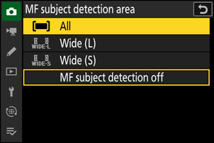Chcete-li povolit detekci objektu během ručního ostření ( 0 Ruční ostření ), vyberte v nabídce fotografování nebo nahrávání videa jinou možnost než [ Detekce MF objektu vypnutá ] pro [ Oblast detekce objektu MF ].