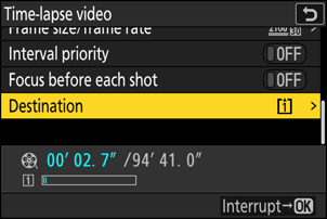 Zvýrazněte slot, který bude použit pro záznam časosběrných videí, když jsou vloženy dvě paměťové karty, a stiskněte J .