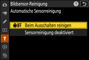 Das Drücken von 2, während [Automatische Sensorreinigung] markiert ist, zeigt die Optionen für [Automatische Sensorreinigung] an.