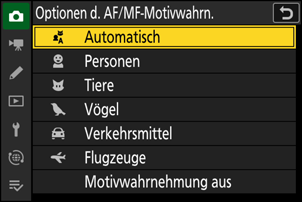 Die Motivkategorien, die bei der automatischen Scharfeinstellung und bei der manuellen Fokussierung mit elektronischer Einstellhilfe Priorität haben sollen, können über den Menüpunkt [Optionen d. AF/MF-Motivwahrn.] im Fotoaufnahmemenü und Videoaufnahmemenü ausgewählt werden, wo die Optionen [Automatisch], [Personen], [Tiere], [Vögel], [Verkehrsmittel], [Flugzeuge] und [Motivwahrnehmung aus] angeboten werden. Die Kamera markiert das erkannte Objekt mit einem Fokusmessfeld.