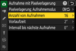 Markieren Sie [Aufnahme mit Pixelverlagerung] im Fotoaufnahmemenü und drücken Sie 2.
