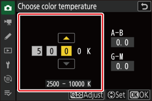 Αφού επιλέξετε μια θερμοκρασία χρώματος, πατήστε το κουμπί W ( Q ) για να εμφανιστούν οι επιλογές μικρορύθμισης. Χρησιμοποιήστε τον πολυ-επιλογέα για να τοποθετήσετε τον κέρσορα στο πλέγμα.