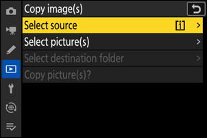 Highlight the slot for the card containing the pictures to be copied and press J to select the highlighted slot and return to the [Copy image(s)] menu.