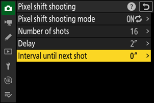 - Highlight [Delay] and press 2. Choose the delay between the shutter-release button being pressed all the way down and the start of pixel shift photography.