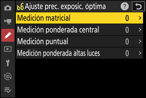 Use esta opción para ajustar con precisión el valor de exposición seleccionado por la cámara; la exposición se puede ajustar con precisión independientemente para cada método de medición. La exposición puede subirse para exposiciones más brillantes o bajarse para exposiciones más oscuras dentro de la gama de +1 a –1 EV en pasos de ¹⁄₆ EV. El valor predeterminado es 0.