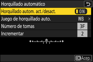 | [Incrementar] | Elija el incremento del horquillado para todas las opciones [Juego de horquillado auto.] excepto [Horq. D-Lighting activo]. |