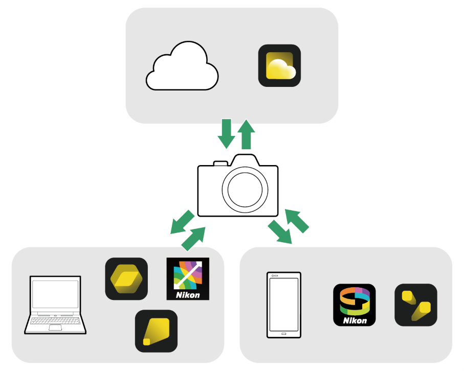 Nikon ha preparado un servicio en la nube, software informático, aplicaciones de dispositivos inteligentes y otro contenido para que pueda disfrutar de sus fotos. Con este contenido podrá compartir los ajustes de la cámara relacionados con el acabado de las fotos que desea tomar, ajustar y procesar las fotos tomadas, transferir fotos a ordenadores y dispositivos inteligentes automáticamente y más.