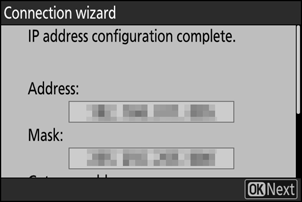 Võimalus Kirjeldus [ Obtain automatically ] Valige see suvand, kui võrk on konfigureeritud IP-aadressi automaatselt edastama. Kui IP-aadress on määratud, kuvatakse teade "konfiguratsioon on lõpetatud". [ Enter manually ] Sisestage IP-aadress, alamvõrgu mask, lüüsi aadress ja domeeninimeserveri ( DNS ) aadress selles järjekorras käsitsi. Üksusi saab sisestada järgmiselt.