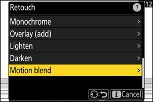 - [ Motion blend ] on mõeldud sarivõtte tegemiseks, mis on tehtud kaameraga statiivil, fikseeritud taustaga ja liikuvate objektidega. Seetõttu ei pruugi ilma statiivita tehtud sarivõttega soovitud tulemusi saavutada.