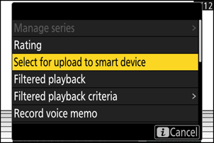 - Kui ühendate teenusega Nikon Imaging Cloud võrgumenüüs [ Nikon Imaging Cloud ] ( 0 Nikon Imaging Cloud ): [ Select for upload to The Cloud ]