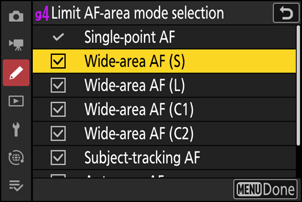 Valitse AF-aluetilat, jotka voidaan valita kääntämällä sivukomentokiekkoa samalla, kun painat säädintä, jolle [ Tarkennustila/tarkennusaluetila ] on määritetty mukautetulla asetuksella g2 [ Mukaut. säädöt ].