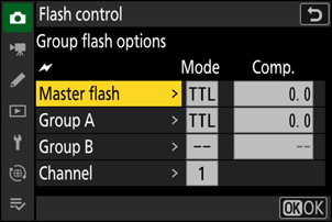 - Jos kyseinen salamayksikkö on SB-500, asetuksia voidaan säätää kamerasta. Lisätietoja on kohdassa "Optisen AWL käyttäminen SB-500:n kanssa" ( 0 Optisen AWL käyttäminen SB-500:n kanssa ). Katso lisätietoja salamalaitteiden mukana toimitetusta dokumentaatiosta.
