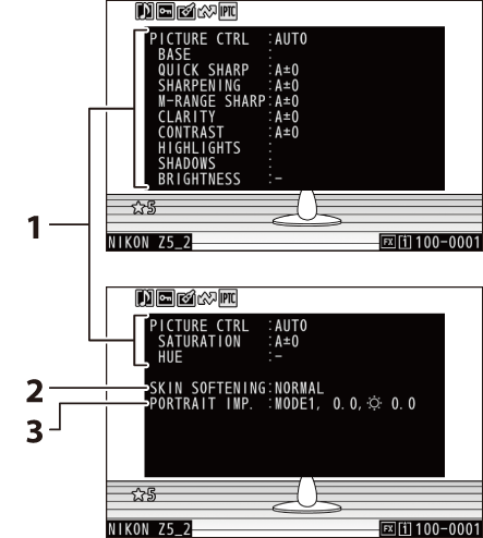 Näytettävät kohteet vaihtelevat kuvan ottamisen aikaan voimassa olleen Picture Control mukaan.