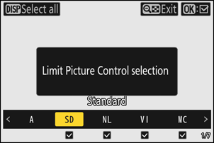 Videotilassa tai kun valokuvatilassa valokuvausvalikon [ Sävytila ] -asetukseksi on valittu [ SDR ], voit rajoittaa käytettävissä olevia kuvansäätimiä h -painikkeella tai i -valikon [ Aseta Picture Control ] -kohdalla.
