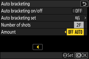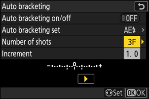| [ Määrä ] | Valitse määrä, jolla Active D-Lighting muuttuu kuvattujen haarukointisarjojen aikana, kun [ ADL-haarukointi ] on valittuna [ Autom. haarukoinnin asetus ]. |