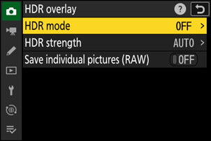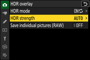 | [ Tallenna yksittäiset kuvat (RAW) ] | Valitse [ ON ] tallentaaksesi jokaisen yksittäisen HDR-kuvan luomiseen käytetyn kuvan; kuvat tallennetaan NEF ( RAW ) -muodossa. |