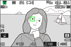 Tarkennuspiste muuttuu vihreäksi, jos kamera pystyy tarkentamaan havaittuaan muotokuvakohteen kasvot tai silmät. Jos kamera ei pysty tarkentamaan, tarkennuspiste vilkkuu punaisena.