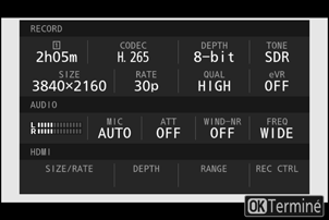 Affichez les réglages d’enregistrement vidéo. Cette option permet d’afficher, mais pas de modifier, l’option sélectionnée.