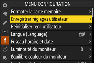 Mettez en surbrillance [Enregistrer réglages utilisateur] dans le menu Configuration et appuyez sur 2.