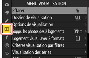 Pour afficher le menu Visualisation, sélectionnez l’onglet D (menu Visualisation) dans les menus de l’appareil photo.