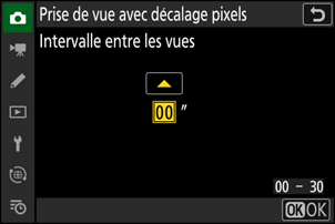 - Mettez en surbrillance [Intervalle entre les vues] et appuyez sur 2. Choisissez l’intervalle entre les prises de vues, en secondes.