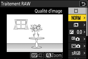 - Modifiez des réglages comme la balance des blancs et les Picture Control avant d’aller plus loin. Si nécessaire, modifiez les réglages en vigueur au moment de la prise de vue. Pour consulter la liste des réglages modifiables, reportez-vous à « Réglages modifiables lors du traitement RAW des images SDR » (0 Réglages modifiables lors du traitement RAW des images SDR).