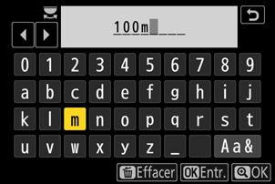 - Pour renommer le profil, appuyez sur J. Pour en savoir plus sur la saisie de texte, reportez-vous à « Saisie de texte » (0 Saisie de texte). Appuyez sur X pour continuer après avoir saisi un nom.