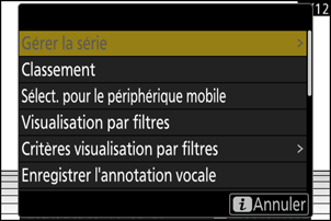 Si [ON] est sélectionné pour [Visualisation des séries] > [Représenter séries par 1 imagette] dans le menu Visualisation, vous pouvez utiliser cette option afin de supprimer, protéger ou marquer pour le transfert la photo actuelle et toutes les autres photos de la même rafale.
