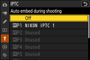 Az [ Autom. beágy. fényképezéskor ] kiemelése és 2 megnyomása megjeleníti az előre beállított értékek listáját. Jelöljön ki egy előbeállítást, és nyomja meg J ; a kiválasztott előbeállítás minden további fényképbe be lesz ágyazva. A beágyazás letiltásához válassza a [ Ki ] lehetőséget.