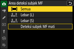 Untuk mengaktifkan deteksi subjek selama fokus manual (0 Fokus manual), pilih opsi selain dari [Deteksi subjek MF mati] untuk [Area deteksi subjek MF] di menu pemotretan foto atau perekaman film.