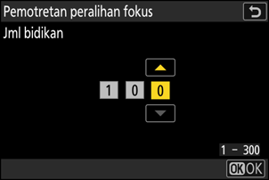 | [Lebar langkah fokus] | Peralihan fokus meragamkan jarak fokus pada serangkaian foto. Pilih jumlah perubahan jarak fokus pada setiap bidikan. |