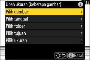 Pilih [Ubah] di menu i, lalu sorot [Ubah ukuran (beberapa gambar)] dan tekan 2.