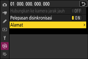 - Jika diinginkan, Anda kemudian dapat mengedit alamat IP kamera dengan menyorot [Alamat] dan menekan 2. Untuk menyambung ulang, pilih [ON] bagi [Hubungkan ke kamera jarak jauh]. Tidak ada sambungan yang akan dibuat jika tidak ada kamera jarak jauh di alamat yang ditentukan.