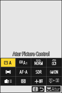 Menekan tombol i dalam mode foto menampilkan item yang tercantum di bawah ini. Sorot item yang diinginkan menggunakan selektor-multi dan tekan J untuk meninjau opsi.