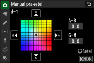 Pra-setel keseimbangan putih dapat ditinjau dengan memilih [Keseimbangan putih] > L [Manual pra-setel] di menu pemotretan foto. Untuk memanggil ulang nilai tersimpan, sorot pra-setel menggunakan selektor-multi dan tekan J.