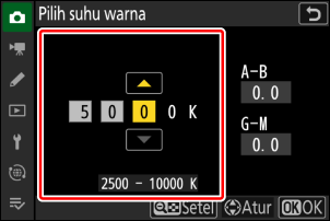 Tahan tombol Fn1 dan putar kenop perintah utama untuk memilih K [Pilih suhu warna].