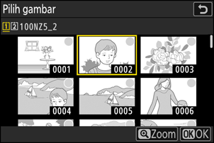 Sorot [Pilih gambar] dan tekan 2 untuk meninjau gambar pada kartu memori sekarang.