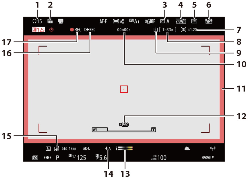 - Indicatore di registrazione (bordo rosso; 0 g19: indicatore del riquadro REC rosso )